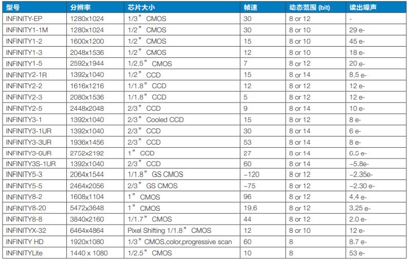 加拿大Lumenera公司的INFINITY系列高性能相機(jī)參數(shù):