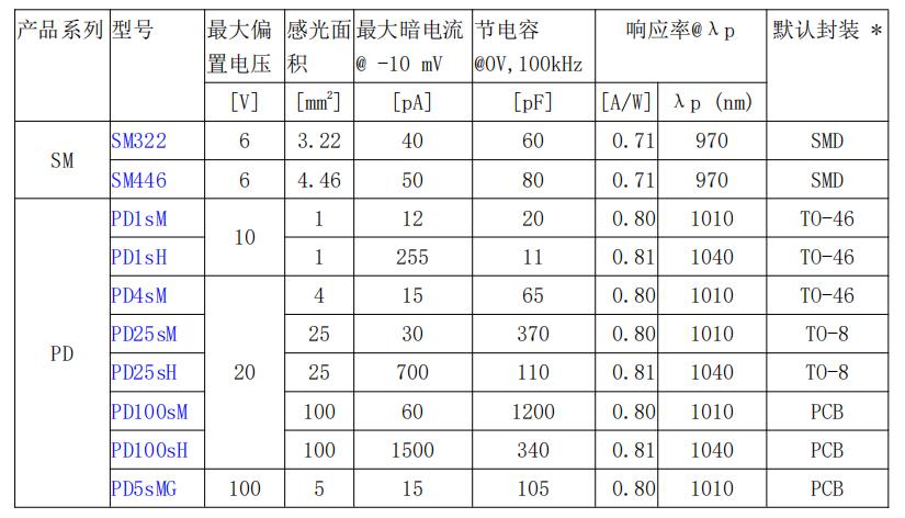黑硅探測器選型表