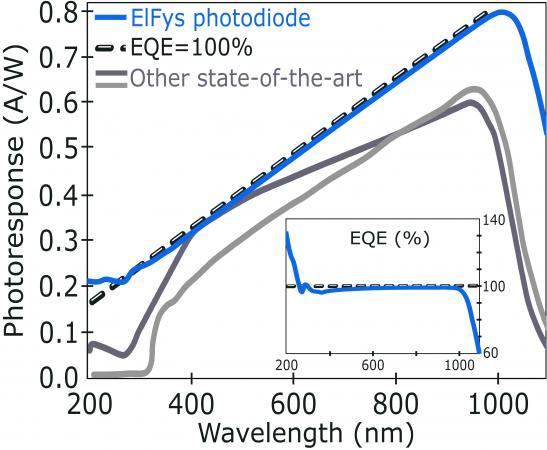 先鋒科技可提供高性能的黑硅探測器,該光電探測器通過采用表面納米結構技術與原子層沉積涂層技術,大大提高了探測器的光收集效率。在 200 nm 至 950 nm 范圍內具有近乎完美的光響應,外量子效率≥ 96%(通過德國國家計量研究院 PTB 認證)。此光電探測器在紫外波段也同樣具有極高的量子效率,比普通的硅光電二極管高出兩倍以上。
