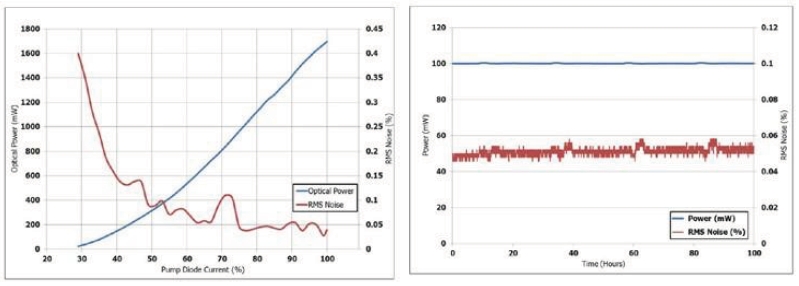 左圖, Ventus 532 藍線為輸出功率, 紅線為RMS 噪聲隨二極體泵浦源驅動電流的變化圖右圖, Ventus 532 出光100 個小時后的輸出功率( 藍線) 及噪聲