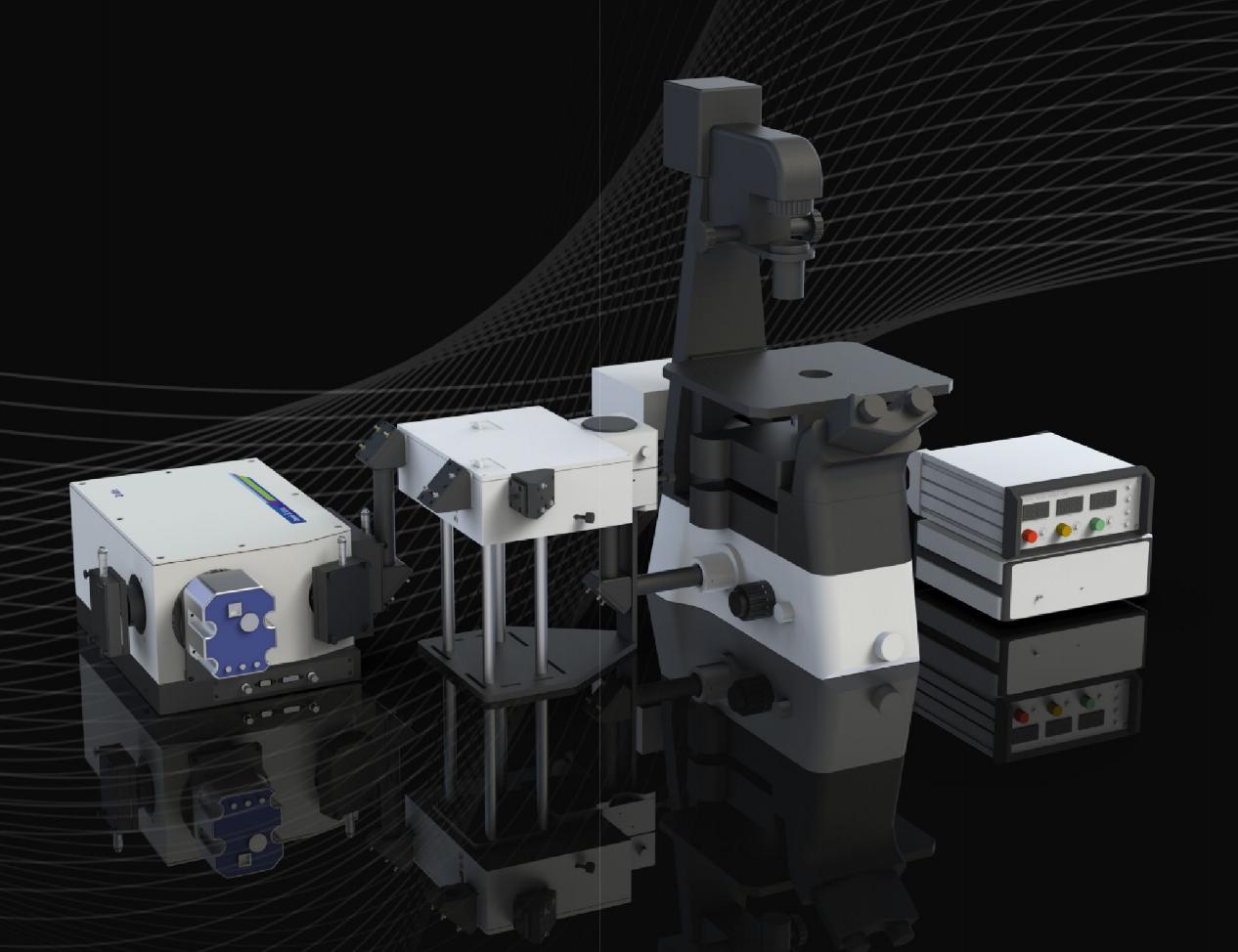 結構二:在卓立漢光自主研制的標準RTS 顯微共聚焦拉曼光譜儀的基礎上配置具有雙層無限遠光路的倒置顯微鏡,上層光路多光阱光鑷系統,拉曼激光從顯微鏡的側口進入,拉曼信號原路返回接光譜儀,可內置不同波長激光器,也可外部耦合激光器,拉曼信號通過光纖或者空間光路耦合到光譜儀,光路如下: