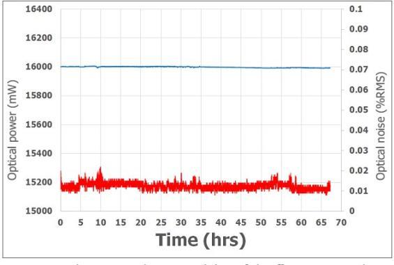 Finesse pure 超過70 小時的出光測試,噪聲( 紅線)~0.01%, 功率穩定度( 藍線)<0.05%;