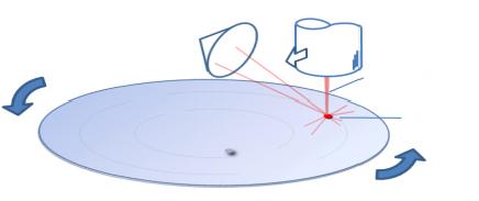 如圖一.激光光束經過聚焦鏡以一定的傾斜角照射到晶圓表面,大部分激光會發(fā)生鏡面反射然后被人工放置的激光吸收器(damper)吸收,小部分會被晶圓表面吸收,極小部分會向各個方向散射。我們在垂直的方向放置一個探測器檢測散射光的強度,通過晶圓的高速旋轉疊加徑掃描實現(xiàn)對于晶圓上所有點的檢測。正常狀態(tài)下探測器檢測到的是微弱的散射本底,向而當激光光束掃描照射到晶圓上的瑕疵時,由于瑕疵點的微區(qū)散射率會小幅度直至大幅度的增加,探測器輸出的信號強度也會等比的變化,以此我們實現(xiàn)了晶圓上瑕疵點的掃描檢測。