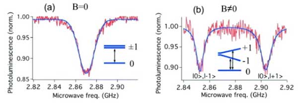 眾所周知,金剛石中的缺陷會使原本透明的晶體產生顏色(例如,氮取代缺陷使金剛石呈現黃色,而硼取代則產生藍色)。在532nm激光激發下,NV在637 nm處產生熒光衰減。重要的是?s=±1自旋態是無輻射衰減,從而提供了一種利用監測光致發光變化來檢測自旋狀態的方法。也就說,當自旋態被激發到不穩定態?s =±1級(使用2.87 GHz微波),有缺陷的紅光輸出會略有減少(圖4 (a))。此外,?s =±1的能級狀態可以被外部磁場調節。通過測量吸收峰之間的頻率分裂(如圖4(b)所示),可以測量出該外部磁場。