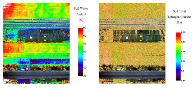 無人機(jī)高光譜系統(tǒng)可以在其高光譜圖像采集過程中獲得土壤水分含量,土壤 總肥力含量和有機(jī)質(zhì)含量分布圖。根據(jù)土壤水分含量和土壤肥力分布圖,農(nóng)戶可 以定量灌溉和施肥,從而解決開支、避免環(huán)境污染。