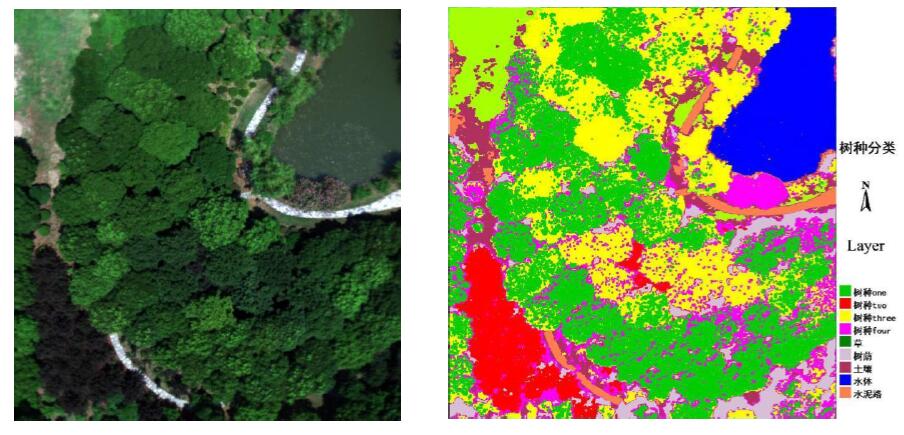 考慮到用戶科研數(shù)據(jù)的保密性,本研究?jī)H用單景高光譜影像數(shù)據(jù)進(jìn)行不同樹 種的分類識(shí)別,分類識(shí)別結(jié)果如下所示。為利用最佳指數(shù)法提取特征波段,并利 用 see5.0 機(jī)器學(xué)習(xí)規(guī)則軟件進(jìn)行樹種分類的效果圖,用戶可利用無人機(jī)高光譜 相機(jī)獲取的多組數(shù)據(jù)進(jìn)行拼接,然后再進(jìn)行樹種的分類,步驟和算法均是相同的。