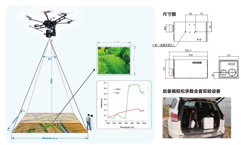 GaiaSky mini3-VN無人機(jī)載高光譜成像系統(tǒng)完美適配大疆M300 RTK。采用內(nèi)置掃描系統(tǒng)和基于大疆Payload SDK開發(fā)的專用三軸增穩(wěn)云臺(tái)系統(tǒng),成功克服了無人機(jī)系統(tǒng)搭載高光譜相機(jī)時(shí),由于無人機(jī)系統(tǒng)的自身震動(dòng),以及飛行過程中由于飛機(jī)偏航、俯仰和翻滾所造成的成像質(zhì)量扭曲變形的問題。在獲取研究對(duì)象的影像的同時(shí)獲得每個(gè)像元的光譜分布,定量分析地球表面生物物理化學(xué)過程和參數(shù),為無人機(jī)載高光譜成像技術(shù)在目標(biāo)識(shí)別、偽裝與反偽裝軍事領(lǐng)域,地面物體與水體遙測(cè)、現(xiàn)代精細(xì)農(nóng)業(yè)等生態(tài)環(huán)境監(jiān)測(cè)等領(lǐng)域的廣泛應(yīng)用奠定了基礎(chǔ)。