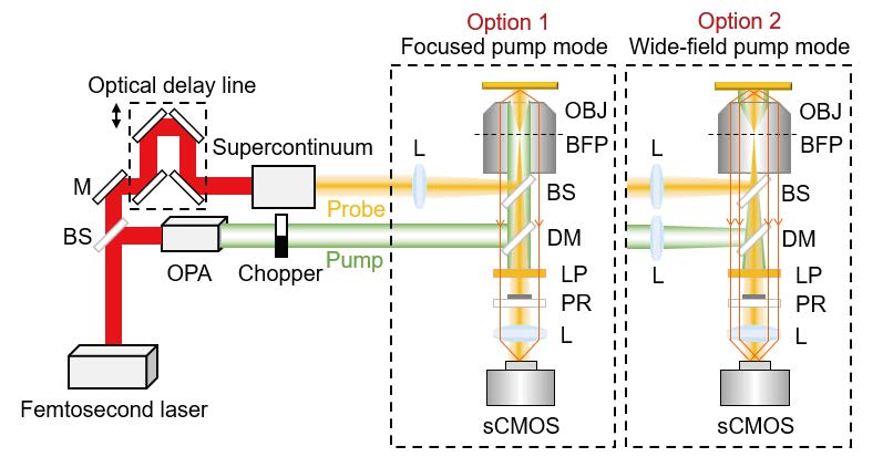 Omni-TAM900寬場(chǎng)飛秒瞬態(tài)吸收成像系統(tǒng)原理如下圖所示,經(jīng)過(guò)飛秒激光器和光學(xué)參量放大器(OPA)之后出來(lái)的飛秒激光,通過(guò)顯微鏡的光學(xué)系統(tǒng)進(jìn)入,并作為泵浦光源激發(fā)樣品,而另一束經(jīng)過(guò)空間調(diào)制的探測(cè)光在一定的時(shí)間延遲之后也經(jīng)過(guò)顯微系統(tǒng)到達(dá)樣品,樣品在激發(fā)態(tài)對(duì)探測(cè)光產(chǎn)生的吸收情況會(huì)被顯微鏡上的sCMOS 相機(jī)記錄下來(lái)。通過(guò)調(diào)節(jié)光學(xué)延遲線(xiàn)(Optical Delay Line),得到樣品在不同延遲時(shí)間下的sCMOS圖像。