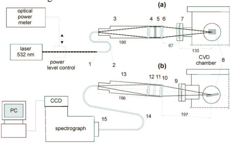 遠程拉曼光譜技術可實現原位監測材料生長過程,如成分含量、結晶度、缺陷量、薄膜生長速率等參數。M. Gnyba 等人設計遠程拉曼光譜技術用于原位監測CVD 制備金剛石膜生長過程,探測距離最高達197mm, 文中采用的工作距離為20cm。