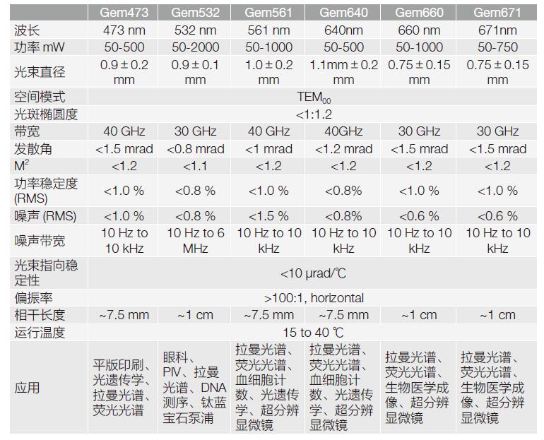 | gem532 | LaserQuantum公司明星產品,高品質單橫模衍射極限傳輸連續綠光激光器,高穩定輸出功率達2W。 | 眼科、PIV、拉曼光譜、DNA測序、鈦寶石/鈦燃料激光器泵浦、熒光成像、生物醫學成像、光刻、激光多普勒測速儀、光遺傳學 |