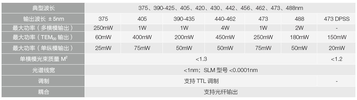 CrystaLaser 提供375 ~ 490nm 的半導體及DPSS 連續輸出激光器: