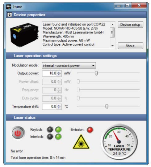 Lambda Beam 系列提供兩種控制器,分別為PowerController 與Power Box,適合分立式與直插式控制。Ltune 軟件可通過PC 監(jiān)測、控制激光器的狀態(tài)。