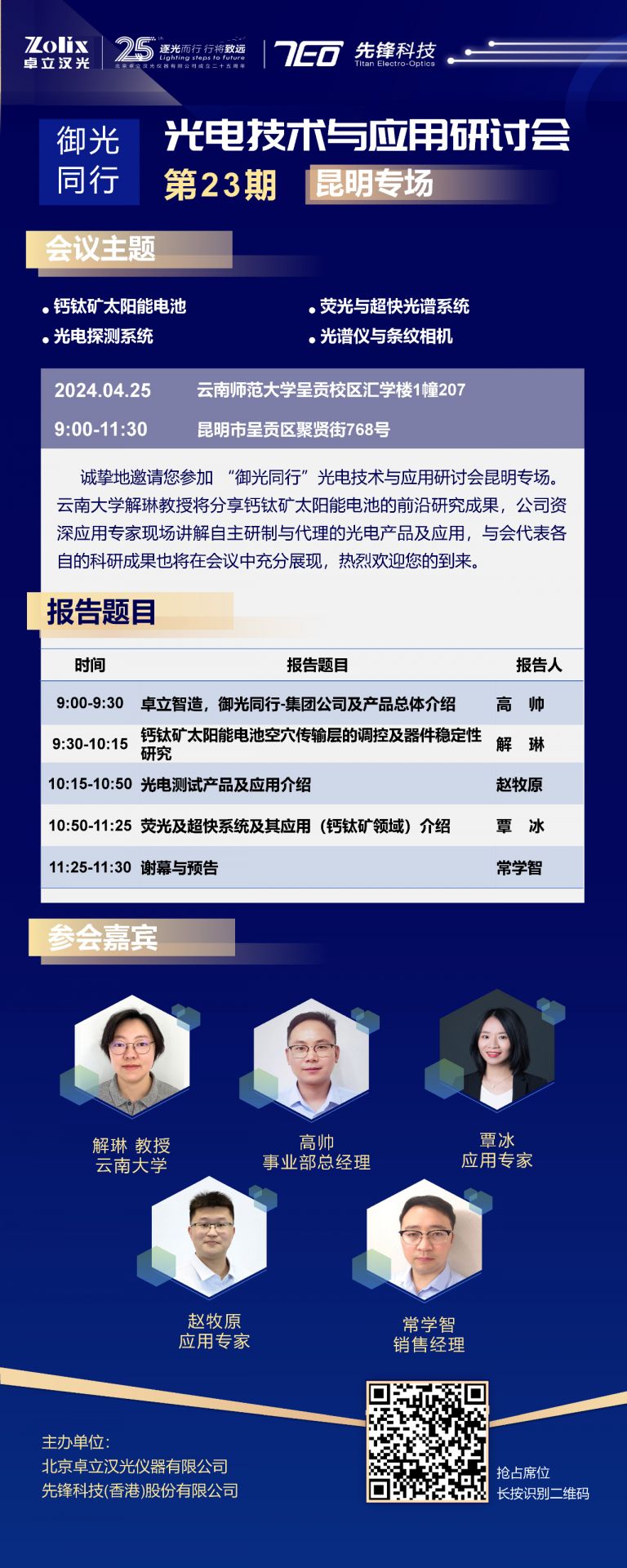 由先鋒科技與卓立漢光聯合舉辦的第23期“御光同行”光電技術與應用研討會昆明專場將于2024年4月25日上午9:00-11:30在昆明召開。