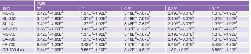 備注:亮度值均是在 2°光闌,PR-730/740:8nm 光譜寬度 , PR-735/745: 14nm 光譜寬度條件下計算得出。