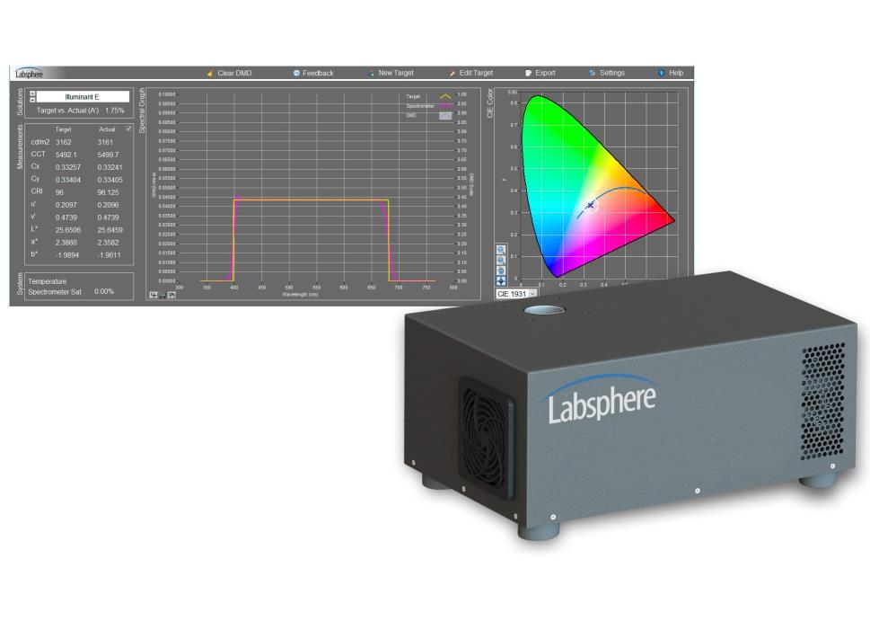 Spectra-UT 超光譜校準光源能夠通過一種復雜的光譜匹配算法,在可見光區域產生近乎完美的任意目標光譜波形。它可以模擬約10 nm半高全寬度的光譜,寬譜可見光光譜和復雜的光譜形狀。