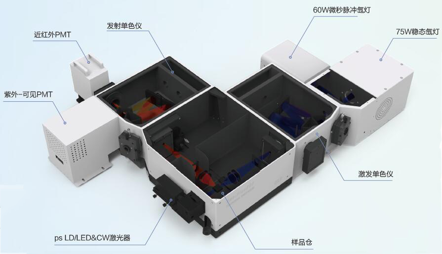 OmniFluo900 熒光光譜儀根據穩態、瞬態測試需求配置DCS210PC 用于穩態熒光測試,DCS900PC 用于穩態- 瞬態熒光測試, 可實現從數百皮秒到秒量級的壽命測量。