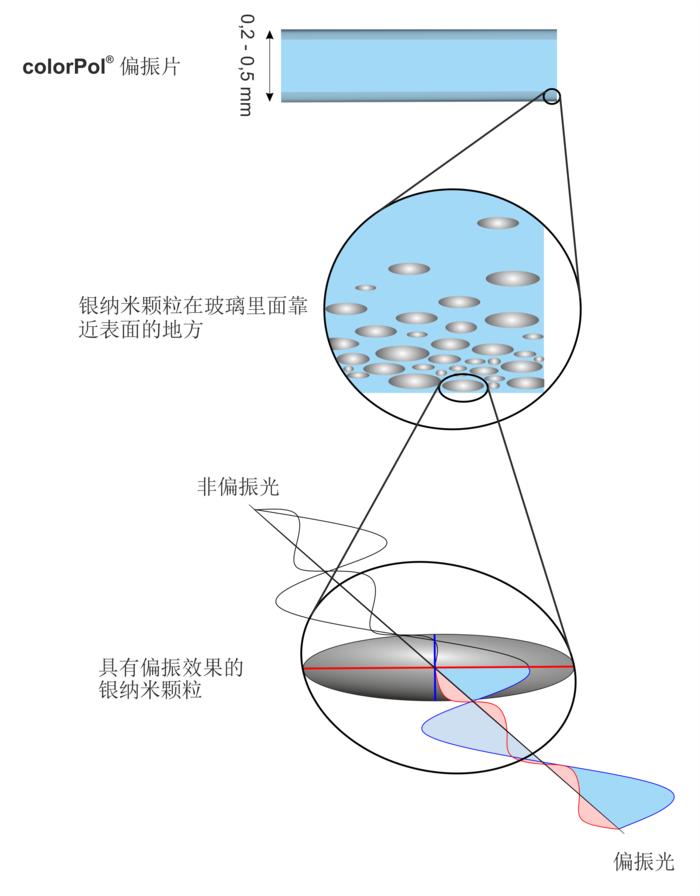 通過CODIXX的特殊制造技術,可以精準確定銀納米顆粒的大小、密度和方向。橢圓形的幾何形狀產(chǎn)生偏振特性所需的一個長軸和一個短軸。它們根據(jù)波長吸收光的所有橫波,僅允許沿對稱軸方向的光波通過。所有納米顆粒的分布必須絕對平行,以產(chǎn)生完美的線偏振光。