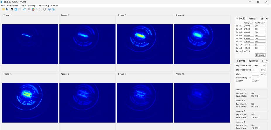 使用與四分幅相機相同的分光光路,將耦合相機改為雙曝光的CCD 相機,可以獲得最高八分幅的相機。此種相機結構即可以工作在四分幅模式下,也可以工作在八分幅模式下。四分幅畫幅之間最小時間間隔1ns, 八分幅相機的畫幅之間第四和第五幅最小時間間隔為250ns(雙曝光模式),其余畫幅間隔最小1ns。