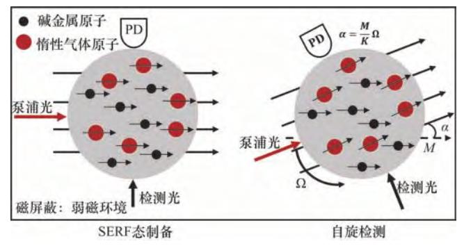 SERF原子自旋陀螺儀利用電子自旋敏感物體轉動,具有精度高、體積小的特點。其主要工作過程為原子SERF態制備以及原子自旋進動檢測。其工作原理如圖 6所示,磁屏蔽裝置使原子處于近零磁場環境中,此時堿金屬原子的拉莫爾進動頻率大幅降低,同時由于高密度高壓環境使自旋交換率極大提升,從而充分抑制原子的自旋交換弛豫,實現SERF態。當載體轉動時,由于電子自旋的定軸性,檢測激光與電子自旋產生的宏觀磁矩M間存在夾角α,通過檢測該角度即可得到載體轉動信息。
