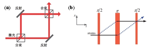 圖 5 (a)Mach-Zehnder光學干涉儀示意圖 (b)三脈沖原子干涉儀示意圖