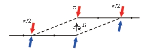 原子干涉陀螺儀的原理與光學干涉陀螺儀類似,利用了原子作為物質波的波動性,基于Sagnac效應完成角速度的測量。原子干涉陀螺儀工作過程主要包含原子團制備、原子分束、原子反射、原子合束和干涉相位測量,其基本原理如圖 8所示。原子束中的原子經內態選擇后全部處于基態,然后經拉曼光脈沖分別實現分束、反射和合束,*后通過干涉條紋的相位測量獲取轉動信息。