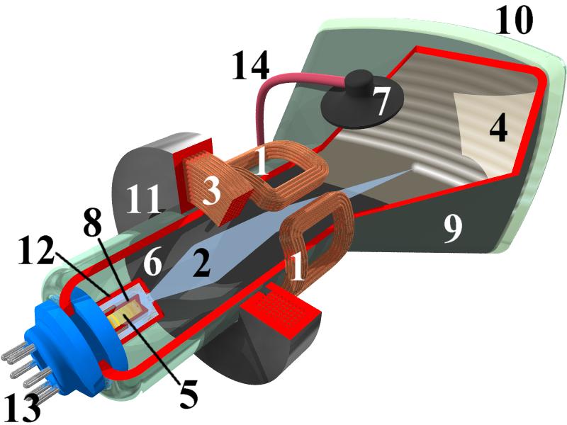 圖1 陰極射線管橫截面圖(不按比例縮放)及其聚焦和偏轉電子束(綠色)