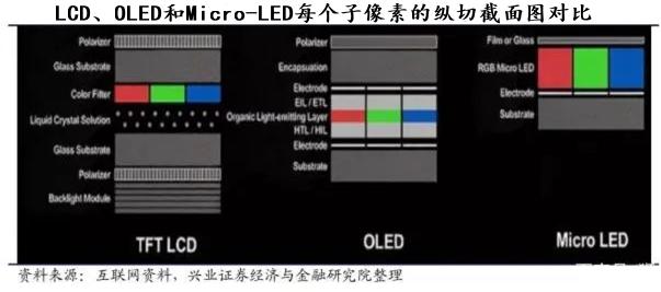 Micro-LED典型結構是一個PN接面二極管,由直接能隙半導體材料構成。當對Micro-LED上下電極施加一正向偏壓,致使電流通過時,電子、空穴對于主動區復合,發射出單一色光。Micro-LED的基本構造分為四塊,最下面是襯底,上一層是電極,再往上是RGB排列的Micro-LED,最外層是玻璃面板。RGB三個子像素組成一個像素。對于一個4K電視機,是八百萬個這樣的微觀結構組成的。由上面的對比圖可見,Micro-LED能達到比OLED更輕薄的效果。