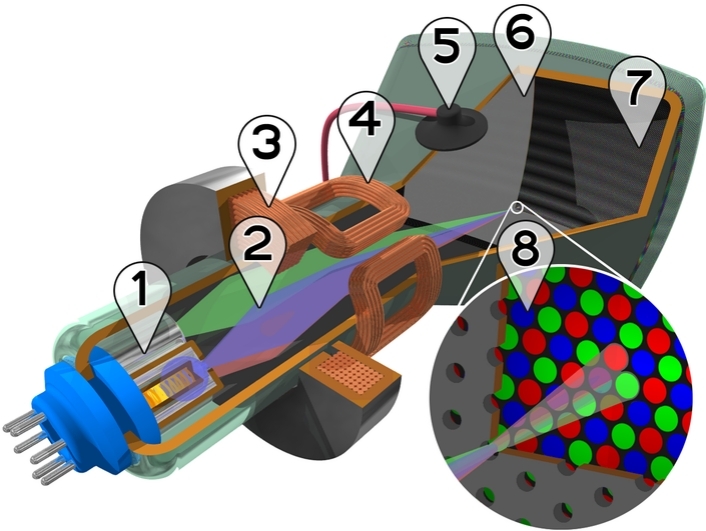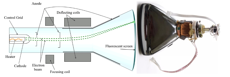 CRT的工作原理是電加熱鎢線圈,而鎢線圈又加熱CRT后部的陰極,使其發射出電子,這些電子被電極調制和聚焦。電子由偏轉線圈或板引導,陽極將它們加速到熒光粉涂層的屏幕,當被電子撞擊時,熒光粉屏幕會產生光。